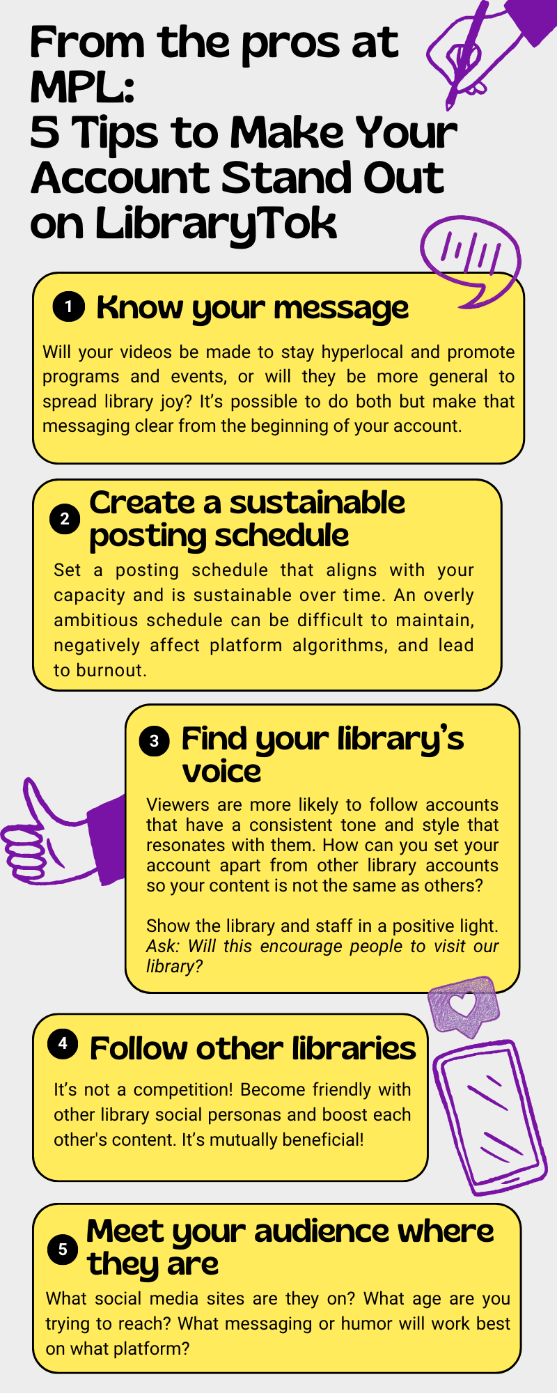 The first step in creating an MPL video is to stay up to date with current trends for inspiration. Siemsen-Fuchs says it's important for MPL’s content to be intentional. “It was a desert when we first started, but now there are so many libraries posting,” she says. “We decided not to copy videos that other libraries do. Rather, we want to celebrate their success and let them have their moment. However, we definitely participate in trends at large and even copy them.”