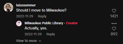 If you haven’t yet encountered them, Milwaukee Public Library has pushed the boundaries of what social media content can look like for a library and has been part of the charge in creating a section of the internet affectionately known as LibraryTok. (While MPL was one of the first major metropolitan libraries to experiment with TikTok-inspired content, staff say accounts like the Fowlerville District Library in Michigan (@fowlervillelibrary) served as a source of motivation.)