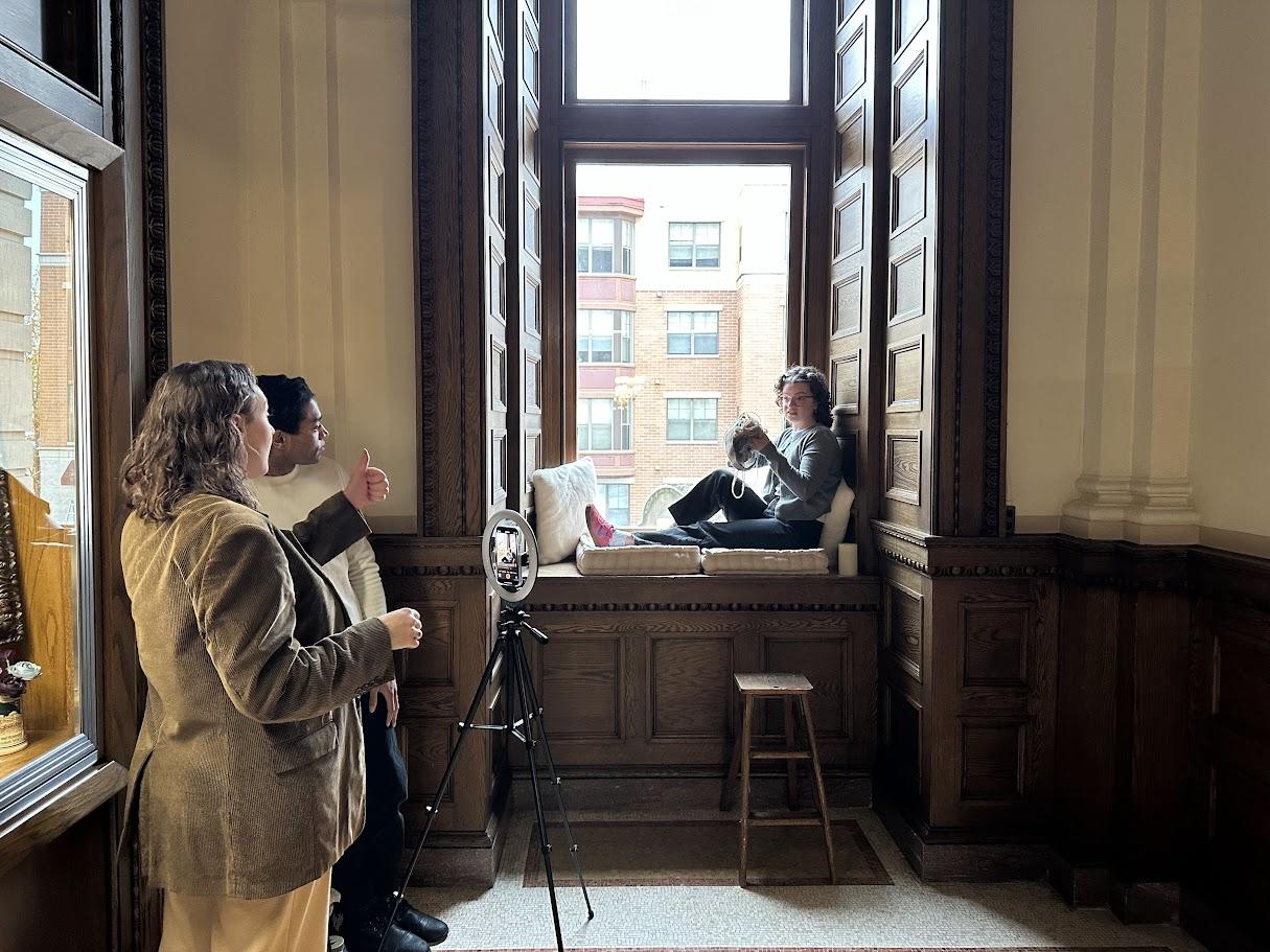 For today’s video, the team hits four locations. They begin in the Old Board Room, then move to a cozy window nook just outside the room, followed by an older space staged to resemble a small apartment. Filming wraps in the Business Commons, where the team shoots against a bright teal wall. Each location is carefully chosen to best capture the warmth and coziness that are central to the “Life with Her” trend.