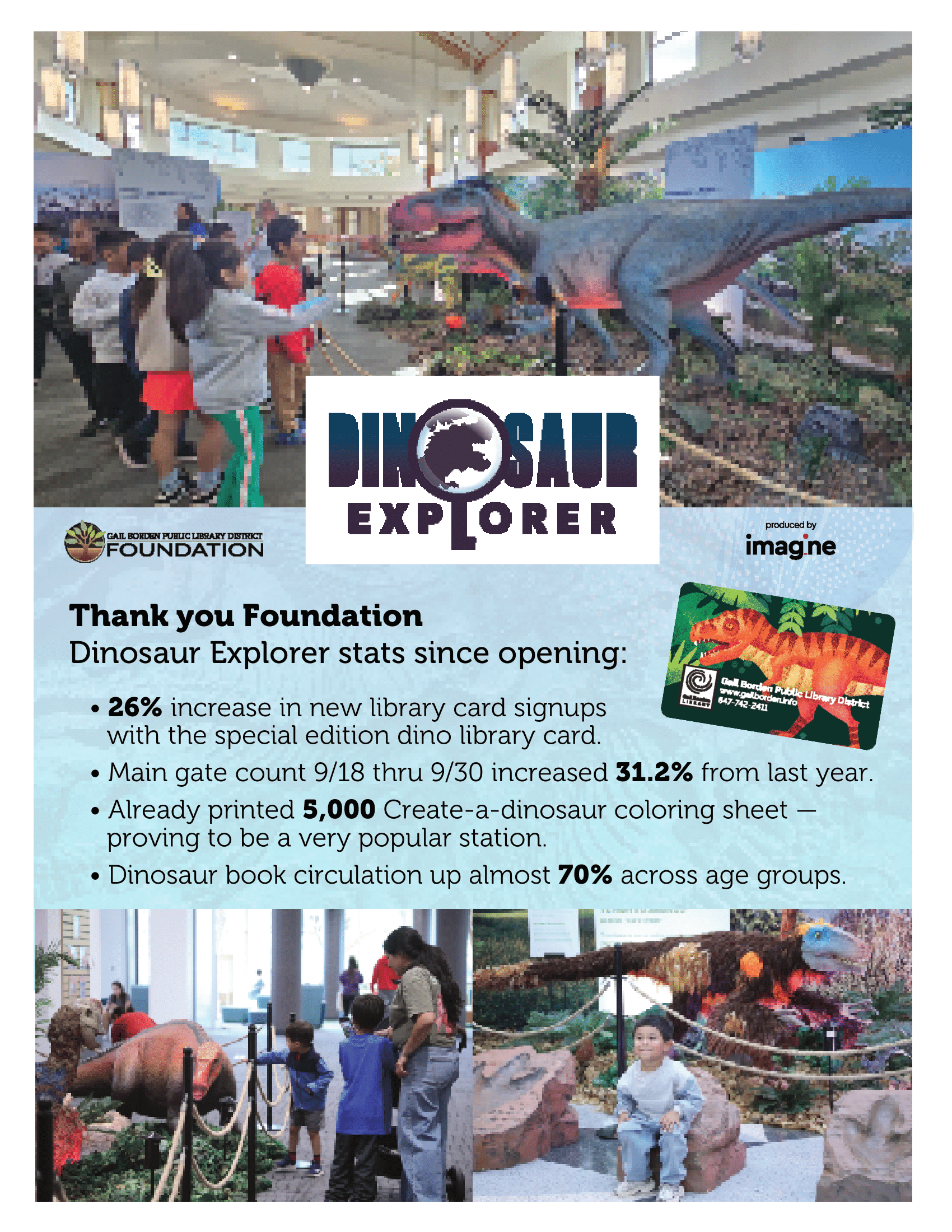 “Our community believes in us,” says Denise Raleigh, director of development. “From the exhibits, we get more library cards and more usage. All of that is our story of return on investment.” Since opening in September 2025, Dinosaur Explorer has sparked a 26% increase in attendance, with dinosaur book circulation up almost 70%.