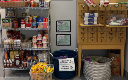 Located in the library, this Community Pantry is a local resource where people can find and donate nonperishable food and hygiene products.