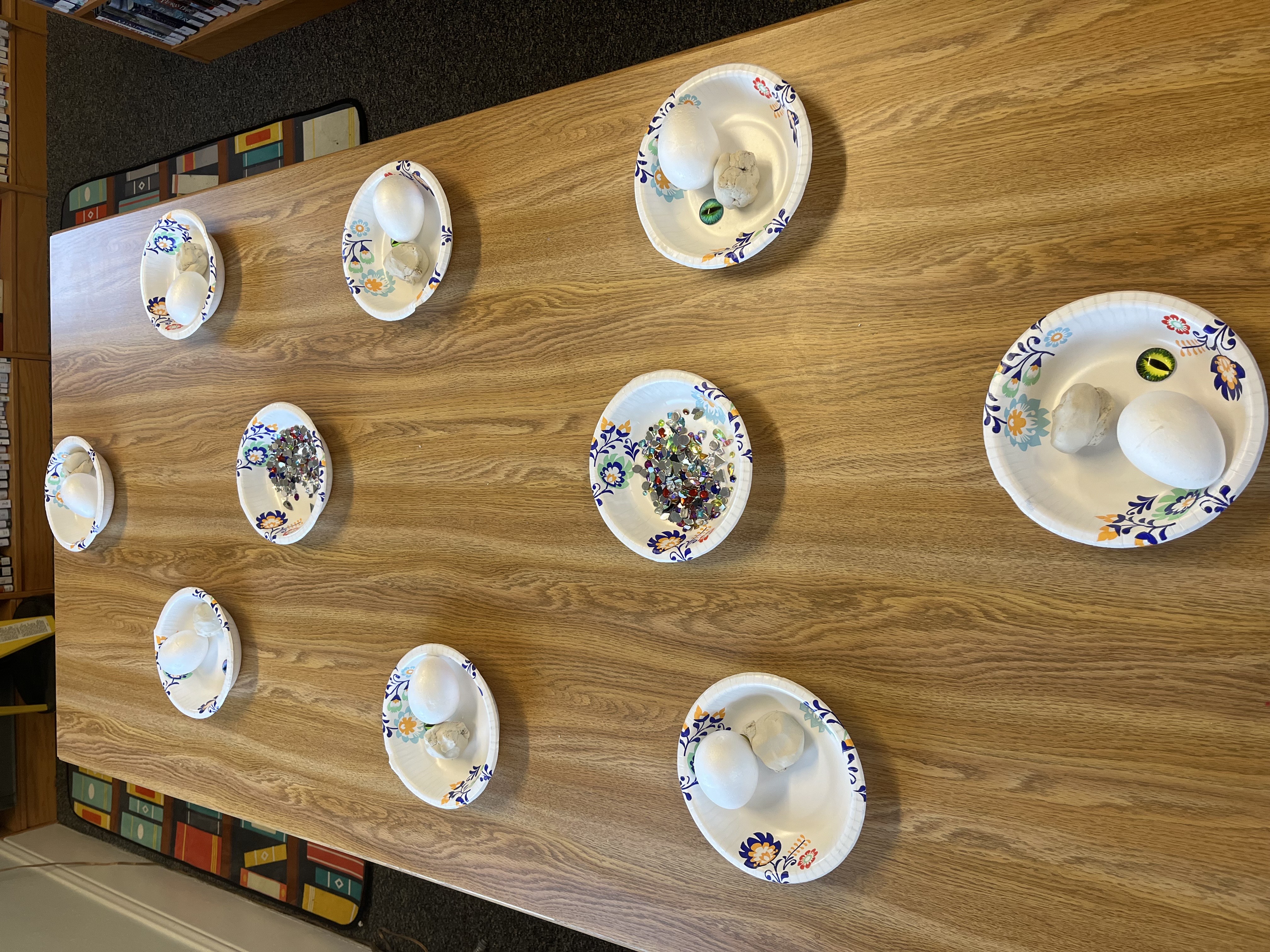 We set up the storytime area with chairs and the dragon books and placed three tables in different areas of our very small library. Each table had eight paper bowls with a ball of clay, an egg, and one dragon eye in it. In the middle of the table, we placed two bowls of gems to share.