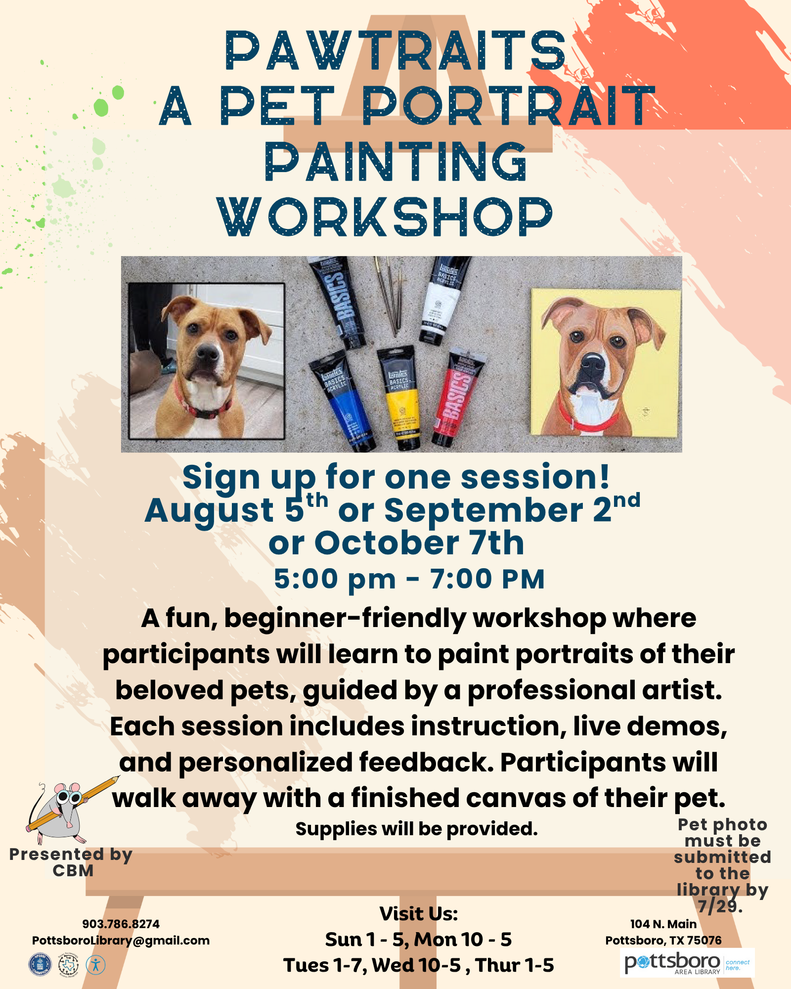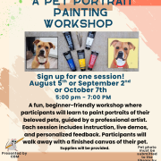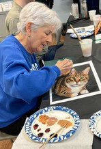 For the Pawtraits classes held at the library, the setup included arranging tables and chairs in a cluster, preparing individual art supply kits, covering tables, setting up display space for examples, and creating a welcoming check-in area. Staff began preparing approximately one hour before each session to complete oom setup and organize materials. One staff member was present during each class to manage sign-ins, assist participants, support the instructor, and handle clean-up. A similar setup and support were provided for the knot-tying and card-making sessions as well.