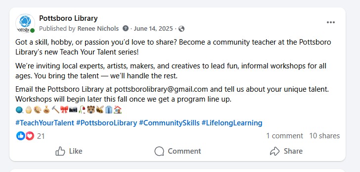 “Teach Your Talent” is a Pottsboro Library program designed to reduce loneliness and build community by encouraging older adults to share their skills and experiences. It began with a social art class series, “Pawtraits,” and expanded into hands-on workshops at community events, where participants both taught and learned creative skills. The program strengthens connections while helping older residents stay socially and mentally engaged.