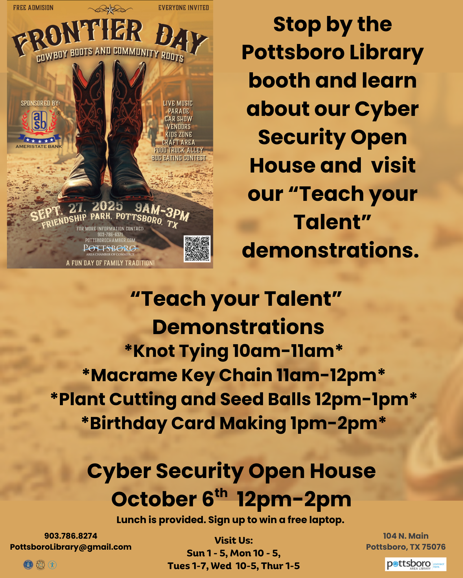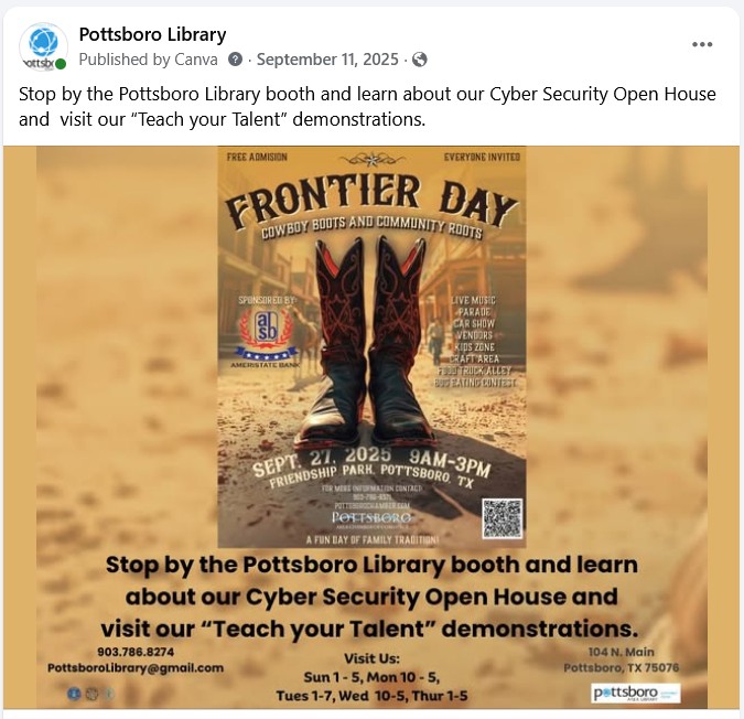 Participation in the Frontier Day Festival required additional coordination with event organizers to align with established festival guidelines. The library submitted program descriptions for inclusion in community event listings, festival schedules, and promotional materials distributed by the organizers. Staff also worked to ensure the workshops were clearly labeled as free, family-friendly, and open to all ages to encourage walk-up participation.